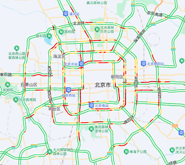 早高峰期间,城区东西部环路南向北,北部环路东向西方向,京藏、京承、京开、京港澳等高速公路进城方向易出现行驶缓慢。团结湖、德胜门、燕莎、高碑店等区域压力较大;菜户营南路、阜石路、西直门北大街等联络线部分路段车流集中。